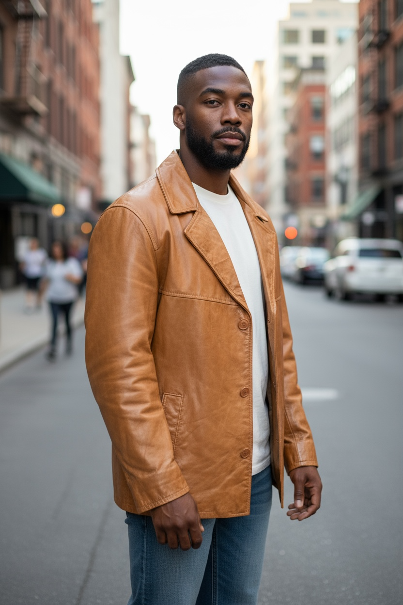 Light cognac in color mens Italian leather blazer, buttons in front for closure, inner lining, inside pockets, size XL