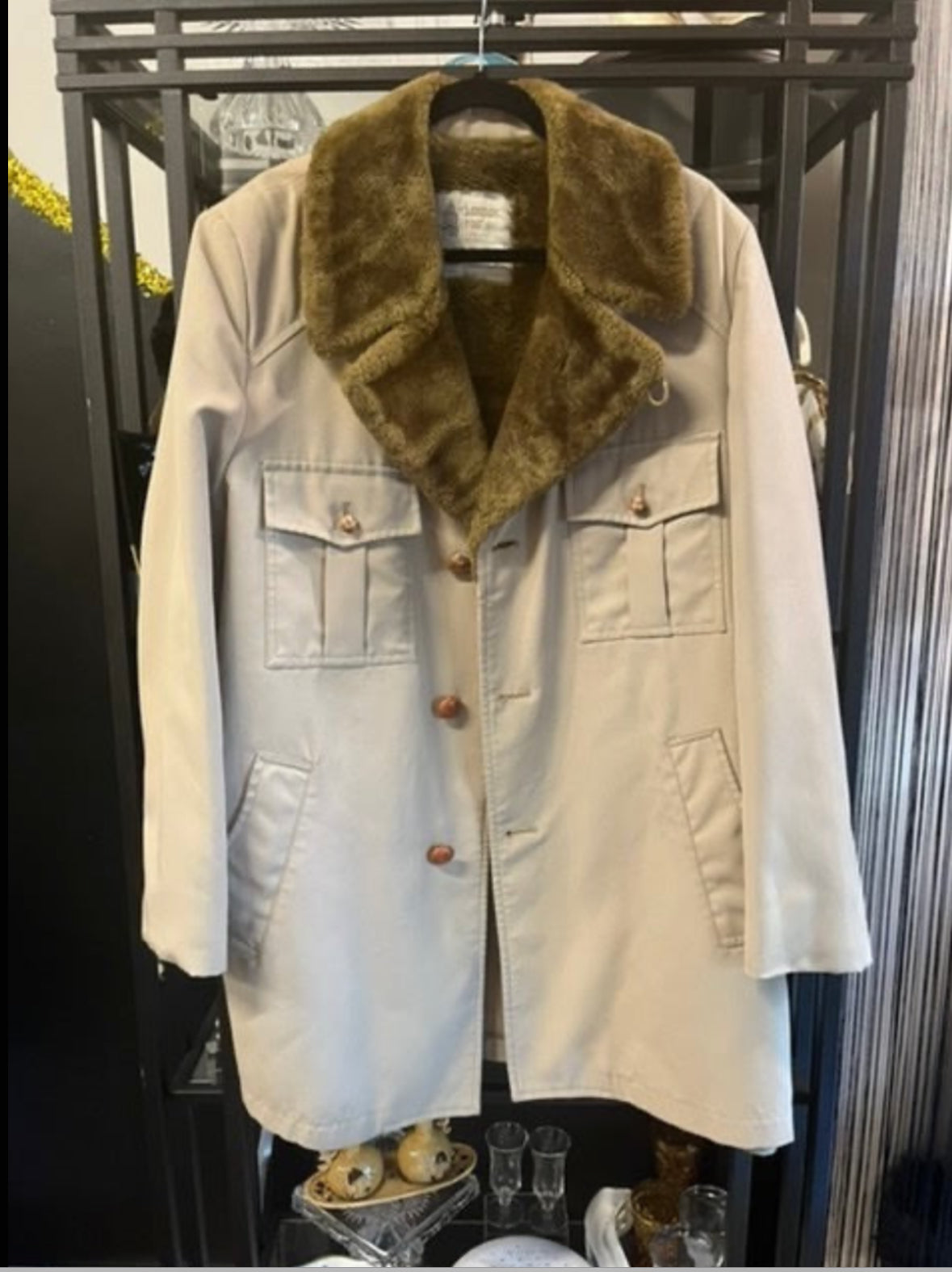 Vintage men’s London Fog Peacoat, size 44 L, cream color with fur collar and inner lining, front pockets, buttons in front for closure.
