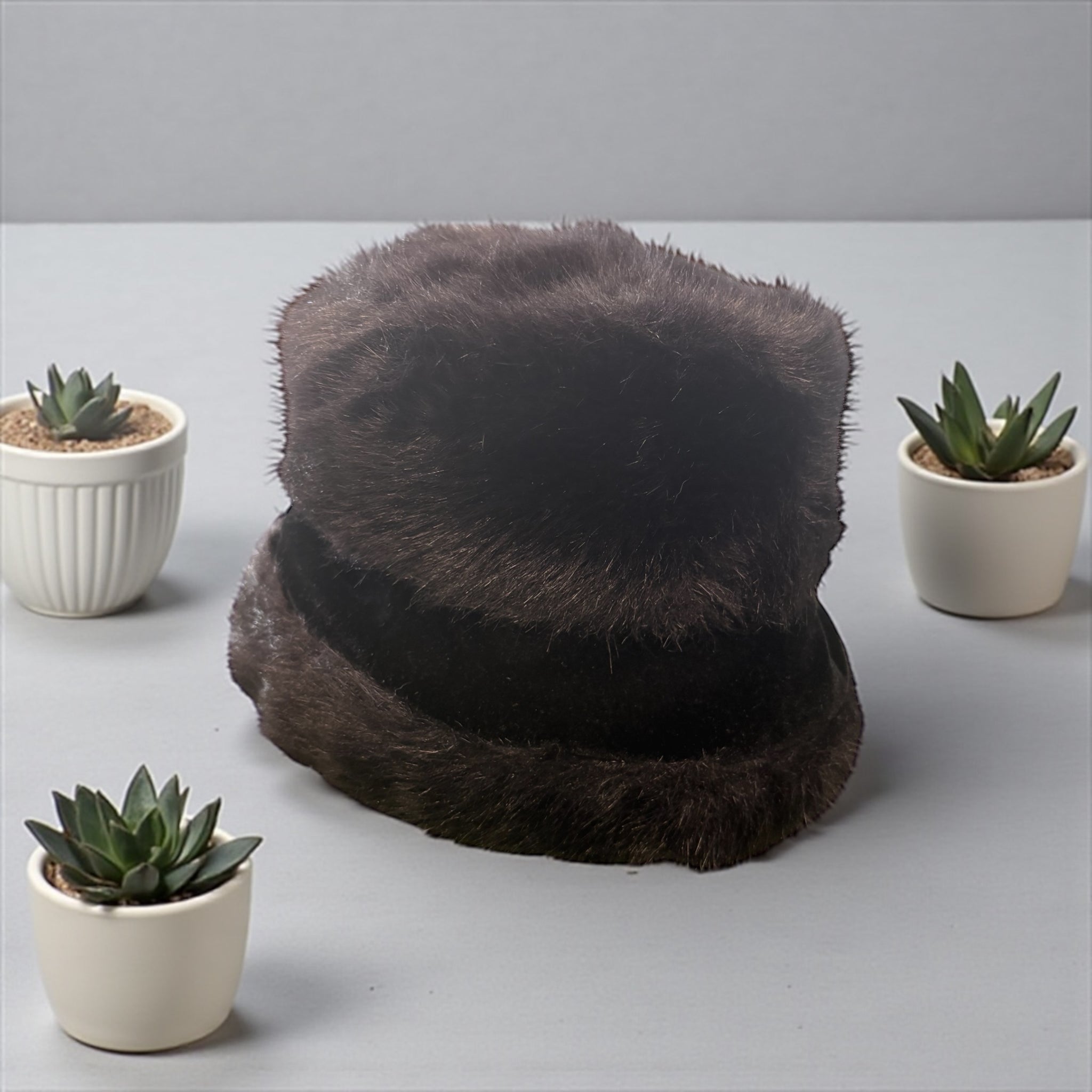 tall faux fur bucket hat, wide suede band by brim, one size fits most, inner lining