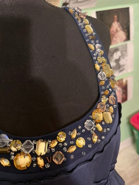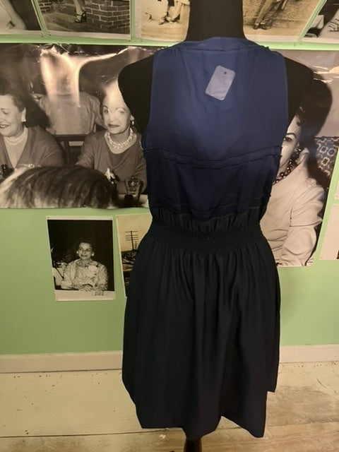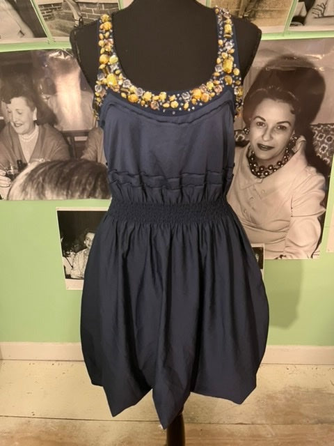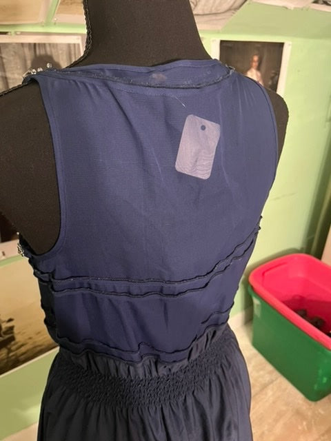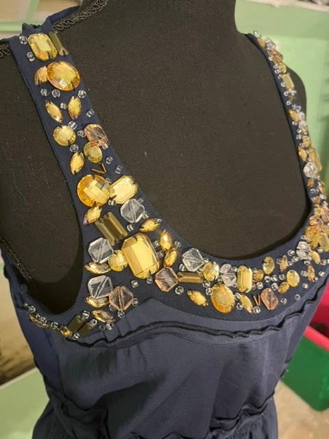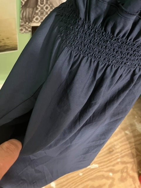 Andrew Marc, midnight blue, scoop neck lined with jewels, elastic waist, no buttons or zippers, puff bottom, side pockets