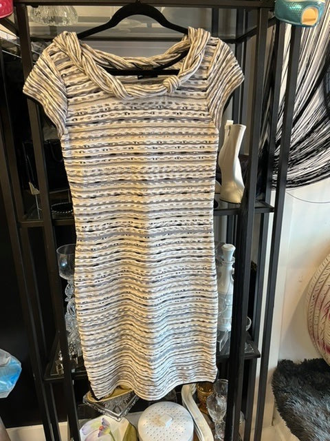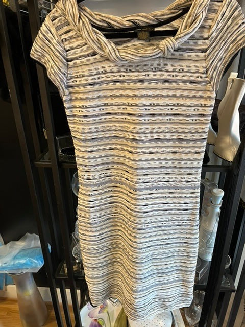 Light weight sweater dress, scoop neck, short sleeve, mid length, natural colors, no buttons or zippers, size M, dress has stretch