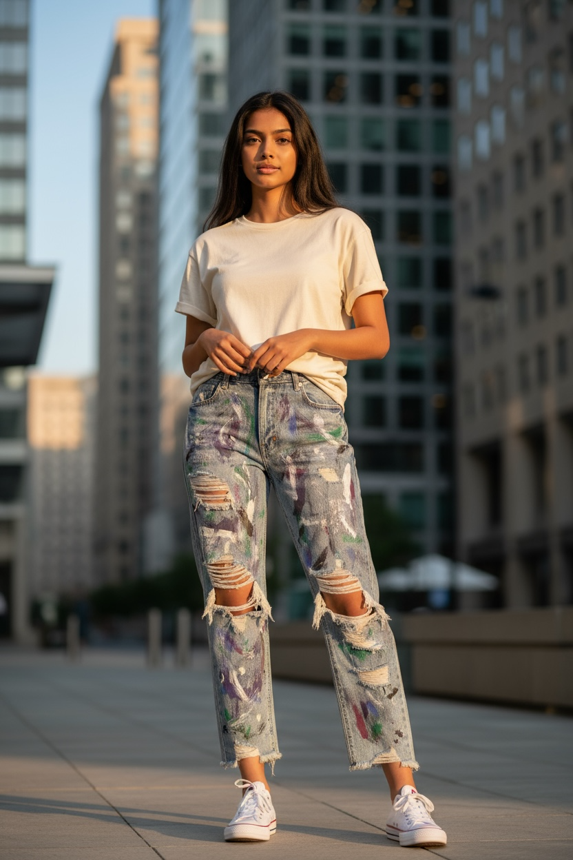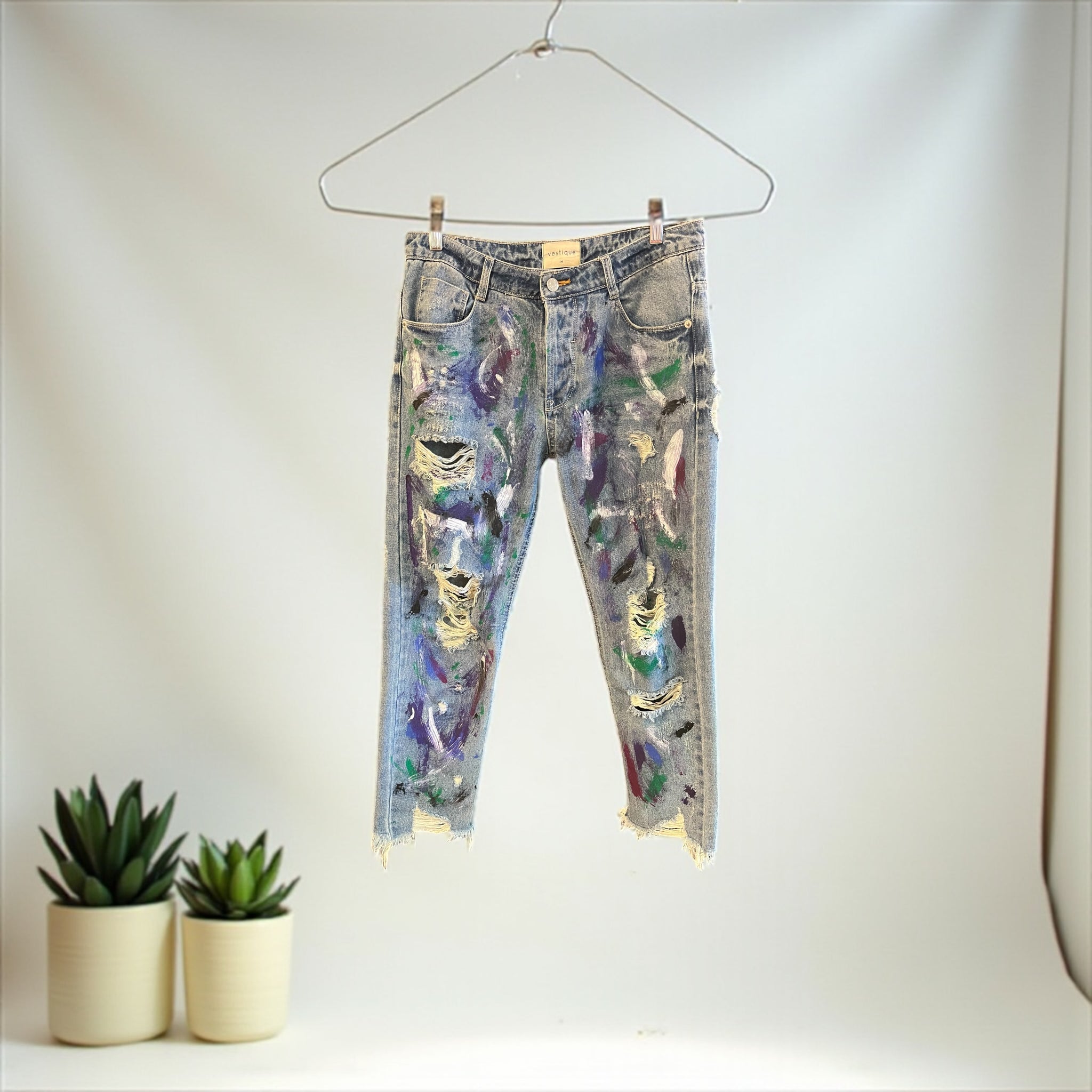 Vestique jeans, distressed, painted front, size medium, colorful design, no stretch