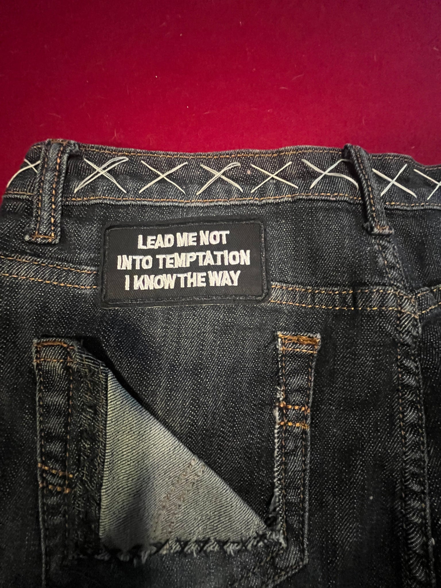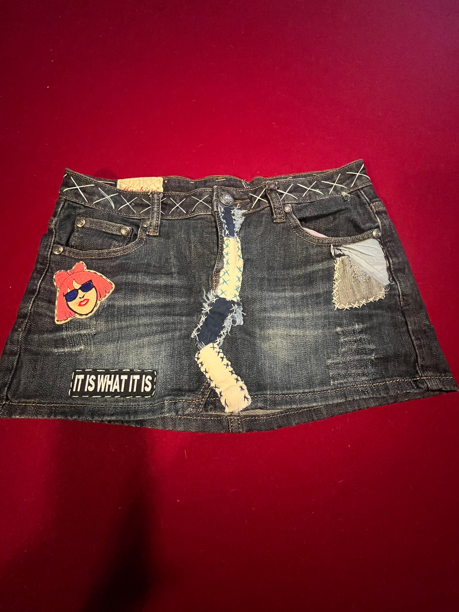 Very short Jean mini skirt, that has been recycled with a cool street design, including patches and unique stitching.
